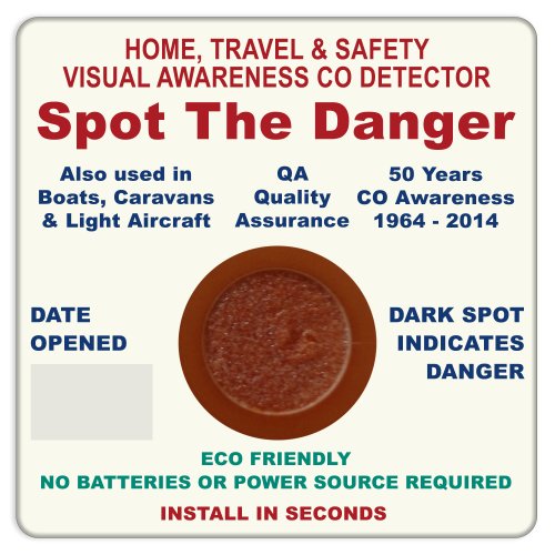 PRODUCT DESCRIPTIONS:50 Year Anniversary Special Edition Design. The visual awareness domestic Spot the Danger carbon monoxide (CO) detector has been designed for the chemical compound on the product to darken and change from the original colour of red/brown in stages to black when high levels of CO Gas are in the vicinity of the detector and is a must-have for households and work places, hotel rooms, student accommodation, caravans and boats, where CO gas from fossil fuels fires are located (It is even successfully used in light aircraft in both the UK and America for the pilot to check for CO gas in the exhaust emissions) Carbon monoxide (CO) gas is an invisible, odourless tasteless gas and is produced by all fossil fuel fires including; gas and solid fuel boilers, water heaters, coal fires and oil fires and the detector should be sited near, but away from direct heat from the appliance. Once opened from its protective packaging, each 'Spot the Danger' carbon monoxide detector has been designed to operative for 100 days, unless activated or deactivated, when it must then be replaced immediately and disposed of as household waste. This CO detector comes with double sided tape so that it can be sited in seconds and is offered to you at a special low price, also has the potential of saving lives from the 'silent killer'. The quality control program includes that every chemical batch is in-house tested and every single CO Detector is lot numbered, thus ensuring full batch traceability. The product has also been independently tested in the UK, Europe and America. The product has been featured and recommended in many national and regional publications, including BBC Television and Radio, Panorama, BBC News, plus being recommended as a good idea in the House of Commons during a debate on carbon monoxide gas.